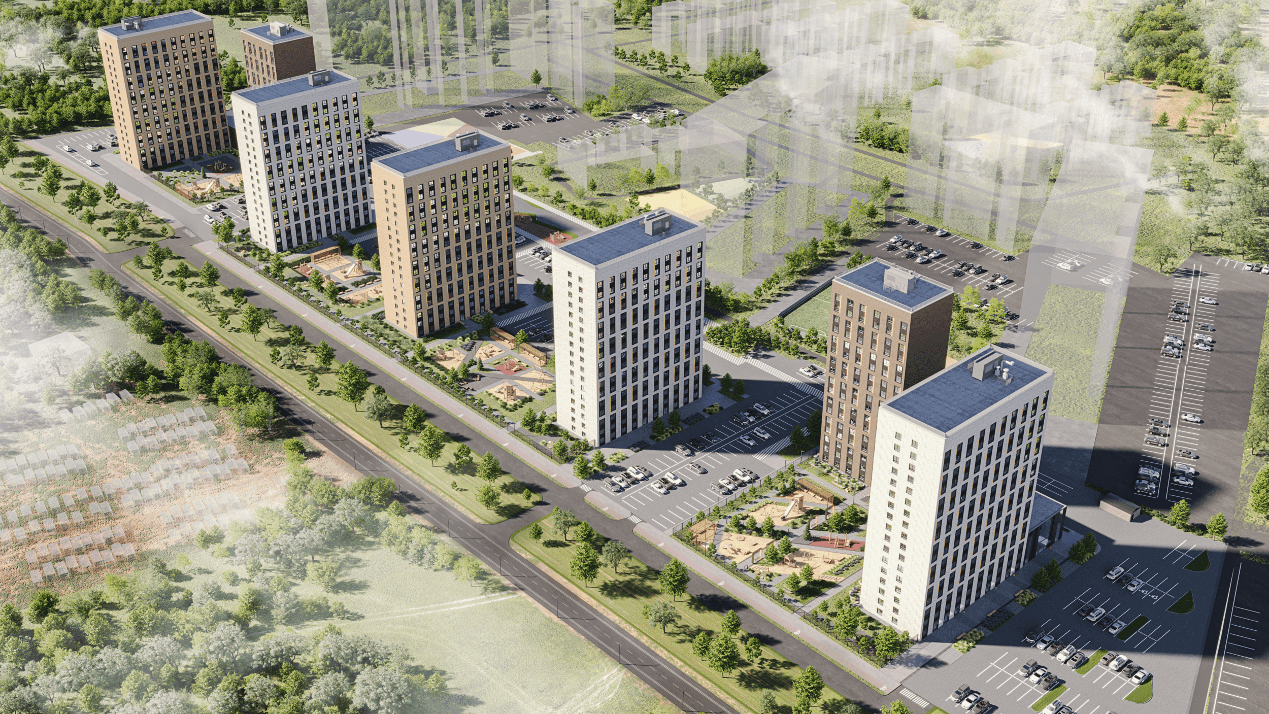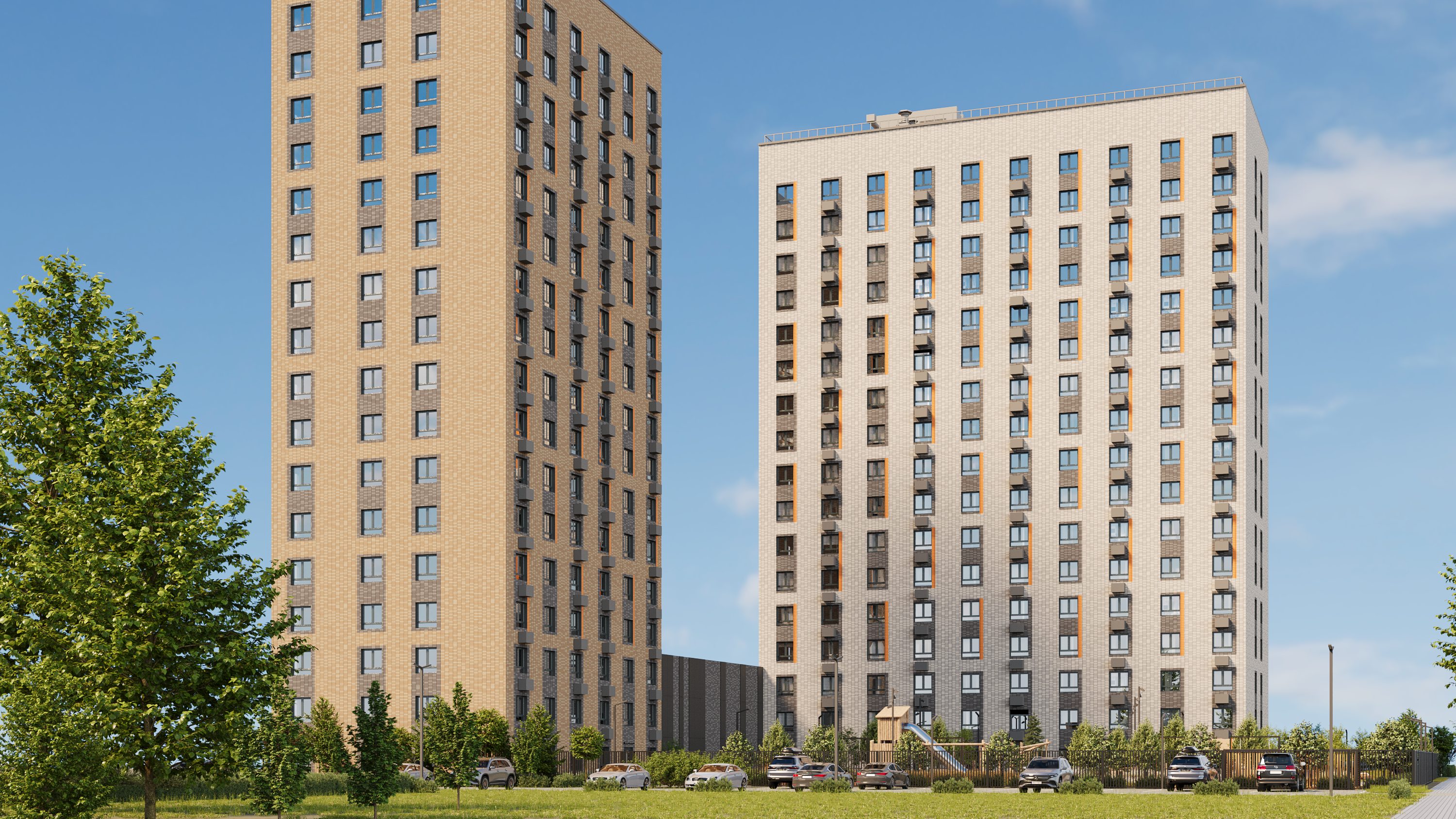 Каждая составляющая этого комплекса создана с учётом динамично развивающихся технологий. Две 17-этажные секции облицованы керамической плиткой в природных оттенках с добавлением ярких акцентов. Они объединены закрытым от машин двором. Уединённый оазис, где спроектированы детские игровые комплексы из натурального дерева, спортивная площадка, места отдыха под теневыми навесами. Каждый житель сможет найти своё место силы. -
